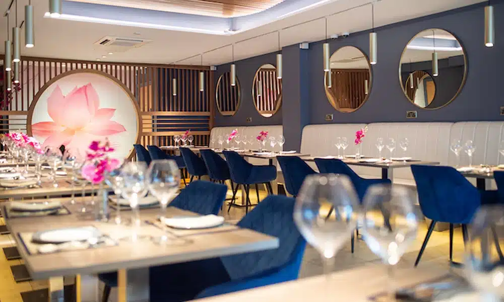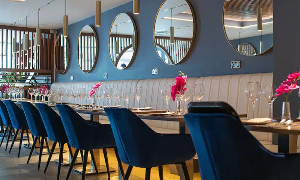 HCF transformed Korat Thai in Upminster with fluted back booth seating, velvet blue quilted chairs and distressed oak tables. Planning a restaurant refit?