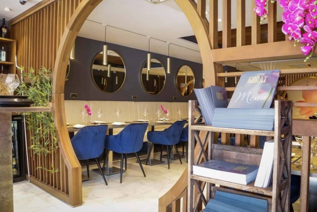 HCF transformed Korat Thai in Upminster with fluted back booth seating, velvet blue quilted chairs and distressed oak tables. Planning a restaurant refit?